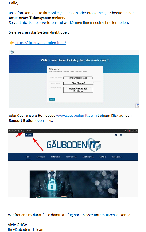 Unser durchdachtes Service-Level-Agreement bietet vor allem Firmenkunden die Möglichkeit, sich auf Ihre eigentlichen Aufgaben zu konzentrieren. Nur so können Ausfallzeiten oder das Risiko von Datenverlust minimiert werden. Unsere Mitarbeiter zeichnen sich durch ihre persönliche, sowie fachliche Qualifikation und ihr hohes Engagement aus. Die Gäuboden IT greift auf mittlerweile 25 Jahre IT- Erfahrung zurück und setzt auf eine partnerschaftliche und von gegenseitigem Vertrauen geprägte Zusammenarbeit.